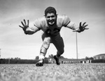 Al Milch is a guard and a mainstay on the rugged line of the Hardin-Simmons University football team. He is a veteran, prewar letterman for the Cowboys. Milch, of San Angelo, Texas, is shown charging the camera in his blocking stance. He is preparing for an upcoming game against Howard Payne University in Abilene, Texas. Milch is wearing a football uniform, number 82.