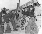 Brigadier General Roger M. Ramey, left, and staff putting up new 8th Air Force sign over headquarters at Fort Worth Army Air Field, 11/05/1946