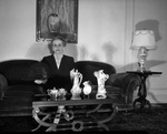 Pictured here is Mrs. R. E. Cox, president of Woman's Club. Her hobbies include talking to people and collecting figurines and small pieces of decorative china, porcelain and bisque. She is the former Bertha Head of Holly Springs, Arkansas. She moved to Fort Worth, Texas as a young girl with her brother and became a Texan when she married her husband, of Stephenville, Texas. She has three children and six grandchildren. In addition to the Woman's Club, Mrs. Cox is an active member of the Mary Isham Keith Chapter, Daughters of the American Revolution (DAR), and the First Methodist Church. She is shown sitting on a couch in her office and holding a Japanese folding hand-held fan in her right hand. She is wearing a dark dress and a pearl necklace and earrings. Several pieces from her china collections are displayed on the coffee table. Published in the Fort Worth Star-Telegram morning edition, November 25, 1946.