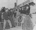 Brig. Gen. Roger M. Ramey, left, and his staff pull down old 58th Bombardment Wing headquarters sign and put up new 8th Air Force Headquarters sign at Carswell Air Force Base, Fort Worth, Texas, 11/05/1946