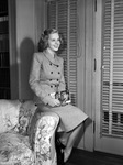 Miss Marguerite Hogsett is a debutante from Fort Worth, Texas. She is the daughter of Mr. and Mrs. Joe B. Hogsett. Miss Hogsett is sitting on the arm of a floral couch. She is wearing a double breasted blazer and a matching skirt. There is a book on her lap is titled "The Battle is the Payoff" by Captain Ralph Ingersoll. Published in the Fort Worth Star-Telegram morning edition, November 10, 1946.