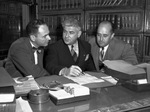 Meeting Democrats are (from left) Burton Paddock, Steward Hellman and G. W. Parker Junior. The men are sitting at a desk, all wearing suits. On the desk are various documents and books. Along the back wall is a bookcase.
