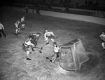 Shown here is an action shot of Dallas Texans vs. Fort Worth Rangers ice hockey game. Ike Eisenzoph, Fort Worth wing, scored in the first period of Thursday night's game despite determined opposition from three Dallas Texans. Squee Allen, No. 15, and big Mike McMahon, No. 2, could not block Ike's shot and Goalie Nick Pidsodny could not keep the puck out of the net. Published in the Fort Worth Star-Telegram evening edition, November 8, 1946.