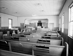 Interior view of Wichita Avenue Methodist Church at Knox and Wichita street, Fort Worth, Texas. This is the church sanctuary showing altar and pews. There are hymnals at the back of each pew.