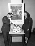 Sergeant John Wood, commandant of a Marine Corps League veterans organization, cutting a cake while Sergeant Sara Langley looks on. On the wall behind them is a poster with a picture of a Marine and the Liberty Bell that reads, "The United States Marine Corps Preserving Peace One Hundred and Seventy-one Years."