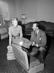 Actor Jeffrey Lynn and his bride, Grace Esther Lynn, packing a suitcase. Mr. Lynn is wearing a suit and Mrs. Lynn is weering a dress with a belt around the waist. In the back of the room is a couch, armchair and a floor lamp.