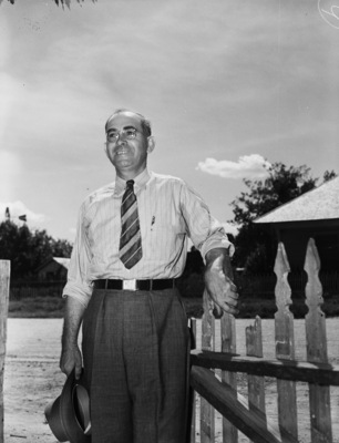 The 54-year-old First Methodist Church Building at Springtown, Texas, is being razed to make way for a larger, rock veneer structure. Reverend D. E. McVey is the pastor. His congregation will build the new church. He is standing outside, leaning against a fence. He is wearing a collared shirt, striped necktie, trousers and round-framed eyeglasses. He is holding his hat in his right hand.