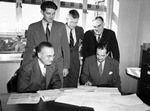 Weather Bureau officials (seated, from left) William R. Thickstun, Leslie Smith, (standing, from left) L. W. Foskett, J. J. Keyser and E. L. Hardy. The officials are gathered around a desk, reviewing weather maps and other documents. All five men are wearing suits.