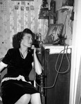 Shown here is Mrs. W. C. Lisby. She is recieving a long-distance phone call from her husband, W. C. Lisby, a technician fifth grade, stationed with Task Force "Williwaw" in the Aleutians. He was sent there in September. The call is celebrating the couple's third wedding anniversary. Mrs. Lisby is sitting in a chair and looking at a photograph of her husband while talking on the phone. She is wearing a dark velvet blouse with lace accents, a matching skirt, and a pearl necklace. Published in the Fort Worth Star-Telegram evening edition, November 12, 1946.