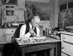 Frantz Koestler is a painter, known for portraits of the Hapsburgs in Vienna, Austria. He is shown working on a picture frame in his studio. He is using a small tool to add a design to the frame. Some of Mr. Koestler's paintings are on display in his studio, including a pot of flowers and a city by the sea. Mr. Koestler is wearing a dress shirt, necktie, and a vest.