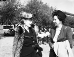 At the get-acquainted meeting of the Texas State Democratic Executive Committee in Corsicana, Mrs. Bennett Smith (right), executive committee member from Fort Worth, chatted with Mrs. R. A. Thompson, Goliad, vice chairman. They met on the grounds of the State Orphan's Home. Mrs. Thompson is wearing a dark dress with a hat and fur shawl. Mrs. Smith is wearing a suit with a dark hat and holding an overcoat and purse in her arms. There are children in uniform in the background. Published in the Fort Worth Star-Telegram evening edition, November 12, 1946.