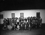 Group of unidentified ex-servicemen from Euless, Texas. In the picture, a group of men are in front of a house posing for the camera. Some are standing, others are squatting or sitting in rows. Most of the men are wearing a suit and tie.