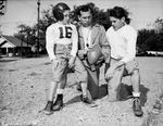 Laneri High School football player Robert Campbell, of the "Little Mick" team, sits on the knee of coach Bobby Sherrod. Raymond Rodriquez is on the right.