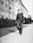 Gene Culbertson is the star fullback on the Arlington Heights High School football team. The two-hundred pound senior will be starting in his 30th consecutive and final high school game against Fort Worth Technical High School. Despite four years with the Yellow Jackets, the blocking back has never scored a touchdown. Culbertson is shown walking in front of the school, dressed in a collared shirt, school sweater, and trousers. His books are tucked underneath his arm.