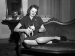 Miss Anne Culver is the daughter of Judge and Mrs. Frank P. Culver. She is shown seated on a couch with her small chihuahua. Anne is wearing a button-up blouse, skirt, and a brooch. The brooch is a silhouette of a Scottish Terrier. Behind her is a small table and a mirror on the wall. Published in the Fort Worth Star-Telegram morning edition, November 17, 1946.