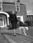 Miss Joann Brown is the daughter of Mr. and Mrs. J. Earle Brown. She is shown strolling down the walkway of her house with her Dalmatian dog on a leash. Miss Brown is wearing a dark dress with a sash tied around her waist, and a jacket. The house and the bushes are in the background. Published in the Fort Worth Star-Telegram morning edition, November 17, 1946.