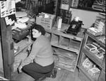Mrs. Ruby Mills, cashier, demonstrating how robbers forced her to sit during the Jack Ingram Grocery robbery.
