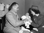 Mr. and Mrs. H. M. Slaughter are amused by their young son, Jimmy. The infant is being held between his parents and yawning. Mr. Slaughter, known as "Tony", is dressed in a houndstooth patterned suit. Mrs. Slaughter is wearing a hat, blouse, blazer, and a skirt. There is a calendar, 1946, hanging on the back wall.