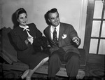 Fitzi, Cocker spaniel, pet of Band-leader and Mrs. Nick Stuart is pictured here with owners. In the picture, Fitzi is seating in between Mr. and Mrs. Stuart on a sofa. They are pointing out with their fingers while they smile at the camera. Mr. Stuart is wearing suit and tie. Mrs. Stuart is wearing suit with a skirt, she also has a hair bow and a neck bow. Mr. Stuart retires temporarily from the spotlight while his master and the Mrs. give attention to a Fort Worth homecoming, incident to Stuart's three-night engagement at Lake Worth Casino. Published in the Fort Worth Star-Telegram morning edition, November 16, 1946.