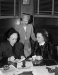 Oakhurst Garden Club lecture committee members (from left) Mrs. Layton B. Armstrong, Mrs. William T. Anderson and Mrs. Charles K. Boatner. In the picture Mrs. Armstrong and Mrs. Boatner are seated on a chair while Mrs Anderson stands in between them resting her hands on both chairs. They are all looking at a document that Mrs. Armstrong is holding in her hand and writing on. Mrs Armstrong and Mrs. Anderson are wearing suits and hats while Mrs. Boatner is wearing a head band and a fur coat. On the desk are documents, two little animal figurines and a transparent globe. They are making plans for a special lecture by Mrs. Dorothy Biddle, author and authority on flower arrangement. Published in the Fort Worth Star-Telegram morning edition, November 17, 1946.