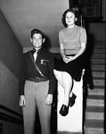 Technological High School homecoming queen for a day Yvonne Brammer with escort Captain Coral Gillham of the Reserve Officers' Training Corps (ROTC). In the picture Brammer is sitting on a stair banister and Gillham stands beside her. She is wearing a short sleeve sweater and a skirt with a beaded necklace while he is wearing his ROTC uniform. They are both smiling as they pose for the picture. Published in the Fort Worth Star-Telegram morning edition, November 16, 1946.