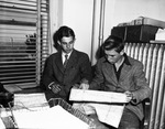 Harry Bader (left) and Elwood Stein, fourteen year old runaways from Bethlehem, Pennsylvania. In the picture, the boys are looking at a map and tracing the route they followed to get to Fort Worth. They are both wearing jackets. One of them is wearing a tie. They are seated on a chair with a table in front of them with papers and other office supplies. Published in the Fort Worth Star-Telegram evening edition, November 15, 1946.