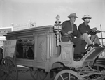 University of Texas vs. Texas Christian University (T. C. U.) football game parade with Wayne Chandler of San Angelo, Texas and Red Maston, driver, in a horse-drawn hearse.