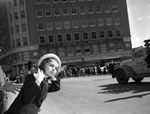 The Moslah Shrine Circus season is opening Saturday afternoon in Fort Worth, Texas. The opening day parade is traveling through the downtown streets. Ten year old spectator, Pattie Jo Linton, is leaning over the curb to see the approach. Wrapped up in the excitement of the Circus, she never spotted the photographer. Pattie Jo is wearing a hat and a coat. The building in the background houses the State Reserve Life Insurance Company.