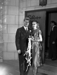 Miss Eleanor Wilson is marrying Mr. Hans Ragnar Isachsen Saturday, November 16, 1946, in Fort Worth, Texas. The newlyweds are shown exiting the church. Mr. Isachsen is a native of Tonsberg, Norway. He is dressed in a double-breasted suit. Mrs. Isachsen is the daughter of Mrs. J. T. Wilson. She is wearing a hat, a satin dress, and a pearl necklace.