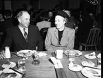 Texas Christian University (TCU) Ex Students Association members, Mr. and Mrs. Edgar Bush of McKinney, Texas are pictured here. In the picture, they are sitting at a a table during ex-students luncheon. The couple are smiling while looking at each other. Mr. Bush has his right hand on a little jug on the table. They are both wearing suits and Mrs. Bush is also wearing a hat. In the background are other unidentified people sitting at their tables. Mr. Bush was a member of the class of 1911, and halfback on the University team in 1909 and 1910. Mrs. Bush was a member of the class of 1921. Published in the Fort Worth Star-Telegram morning edition, November 17, 1946.
