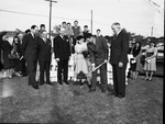 Attending groundbreaking ceremonies for the Oakhurst Presbyterian Church's new auditorium are (from left) Reverend (Rev.) Fred W. Tyler, pastor; Reverend (Rev.) J. F. Hardie, Reverend (Rev.) Robert Boshen, Mrs. W. G. Phillips, Roland B. McGinnis and W. E. Hurt. In the picture, there is a group of unidentified people gathered outside for the service. Roland B. McGinnis is breaking the ground with a shovel while everyone is watching. The people are dressed in either suits and pants or a skirt. Construction of auditorium will begin immediately and is expected to be completed early next year. Published in the Fort Worth Star-Telegram morning edition, November 18, 1946.