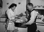 Mr. and Mrs. F. S. Beneke are hosting an early Thanksgiving for their son, Tex Beneke. Tex is visiting Fort Worth, Texas, with his Glenn Miller Orchestra. Mrs. Beneke is shown seasoning the turkey. She is wearing a button-up blouse, a skirt, and an apron. Mr. Beneke is wearing a striped shirt, necktie, vest, and trousers.