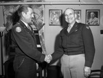 Brigadier General Roger M. Ramey, left, chief of staff, and Major General Clements McMullen, commanding general of new 8th Air Force. The men are shaking hands and are wearing their respective uniforms.