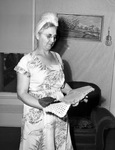 Mrs. A. T. Quattlebaum Senior (Sr.), of Cleburne, Texas, is displaying a set of the hot dish mats woven for her by her son A. T. Quattlebaum Junior (Jr.). A. T. doesn't let his spastic paralysis prevent him from doing things he loves. He uses his toes to weave and write on a typewriter. Mrs. Quattlebaum is admiring the detail in her son's work. She is wearing her hair in a scarf and a dress with a feather pattern and eyeglasses. Published in the Fort Worth Star-Telegram evening edition, November 21, 1946.