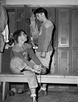 The Handley High School football team is preparing for a game against the Diamond Hill Eagles Thursday at Farrington Field. The winner of the game will be the District 14-A champions. Pictured in the locker room after practice, left to right, are Jack Hart (7) and Jake Cook. Both Handley backs are dressed in their football uniforms. Cook has scored three time sin the last two games and may start in place of injured teammate Curtis Ketchum.