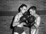 The Young Men's Christian Association (Y. M. C. A.) is holding a boxing demonstration Monday evening. Participants, left to right, are Charles Robinson and Ed Baldwin. They are shown polishing their technique before the show. Both men are dressed in boxing gloves and boxing trunks.