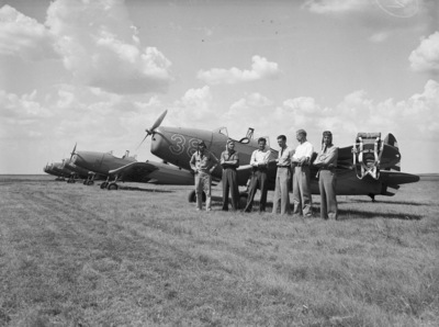 Hicks Field. Love Field civilian instructors who flew planes here, left to right, M. P. Exline, F. C. Miller, G. A. Englert, T. W. Adair and S. Garber. Fort Worth Star-Telegram Morning Edition 1940-08-01. Photograph of six men standing in a grassy field. In the background close to them are six, two seater, small aircraft. They are all dressed in civilian clothing. Three of the men are wearing flight training helmets and goggles. The men are now civilian flight instructors. They previously flew planes at Hicks Field when they were in the military.