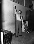 Terry S. Williams holding a belt he made. His left arm is raised to show the length of the belt, which is touching the floor.