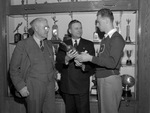 Price Daniel (center) of Liberty, Texas, state attorney general-elect, with C. W. Berry (left) and Greg Sherry. The men are standing in front of a trophy case and Daniel is holding one of the trophies.