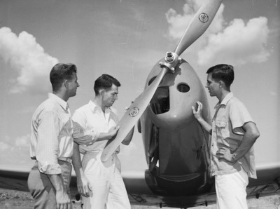 Hicks Field. Three cadets looking at a new plane. They are, left to right, John C. Dixon, Phoenix, Arizona, Arthur Nash, Haydon, Arizona and Alex Oliphant, Chester, South Carolina. Photograph of three young men standing next to a military aircraft. They are dressed in civilian clothing. All three are touching the plane.