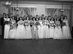 The Temple Beth-El Sisterhood Charity Ball is being held at the Blackstone Hotel in Fort Worth, Texas. The debutantes presented at the ball are shown with their escorts. The women wearing their formal gowns, left to right, are Eleanor Sandler, Hattie Lederman, Doris Jean Cohn, Leah Drescher, Betty Jean Rosen, Rita Anne Sheldon, Bayla Sheinberg, Rita Mallin, Marilyn Brachman, and Iva Greenspun. The men, dressed in tuxedos, left to right, are Carl Abramson, Burton Teter, Paul Labovitz, Joe Albert Sandler, Gilbert Friedson, Teddy Hendelman, Joe Robinson, Herschel Kershman, Harry Rubinstein, and Norman Rubin. Published in The Fort Worth Star-Telegram Morning Edition November 21, 1946.
