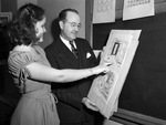 Carole Humphrey (left) and Doctor R. B. Hodges at the McLean Junior High School open house. They are viewing some of the students' artwork. Miss Humphrey is wearing a dress and Doctor Hodges is wearing a suit and eyeglasses.