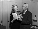 Ouida Ferguson Nalle, a writer, and her husband, George Nalle, reading one of Mrs. Nalle's books, titled "The Fergusons of Texas." Mrs. Nalle is wearing a dress and her husband is wearing a suit. They are standing in front of a doorway.