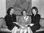Miss Mary B. Merritt, center, national Pan Hellenic representative of Phi Mu sorority and dean of women at Miami University, talking with Mrs. L. A. Freear, left, and Mrs. Lee Kirkwood, members of the alumnae chapter in Fort Worth, Texas. The women are sitting on a couch, reviewing a booklet. All three are wearing dresses.