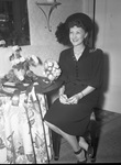 Mrs. William D. Baird with her prize winning entry at the Junior Women's Garden Club show. Mrs. Baird is wearing a dress and a hat, and is sitting next to a table on which her flower arrangement is displayed.