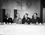 Water-Way officials and backers of the Trinity River program. Left to right, John M. Fouts, general manager of Trinity River Important Association.; Fritz G. Lanham, Amon Carter, Colonel. Henry Hutchings Jr., Dallas; Dale Miller, Washington, D. C. and Melvin J. Miller, vice president of Fort Worth Chamber of Commerce. The men are seated at a table with plates of food, glass cups, tea cups, saucers, and other condiments. They are wearing suits and ties except for Colonel Hutchings Jr. who is dressed in his military uniform. In the background, on the wall, there is a map of Texas with some places highlighted.