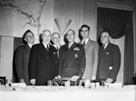 Water-Way officials and backers of Trinity River program. Left to right, John M. Fouts, general manager of Trinity River Important Assn.; Fritz G. Lanham, Amon Carter, Col. Henry Hutchings Jr., Dallas; Dale Miller, Washington, D. C. and Melvin J. Miller, vice president of Fort Worth Chamber of Commerce. The men are standing in front of a table with plates of food, glass cups, tea cups, saucers, and other condiments. They are wearing suits and ties except for Colonel Hutchings Jr. who is dressed in his military uniform. Some of the men are also wearing eyeglasses. In the background, on the wall, there is a map of Texas with some places highlighted.