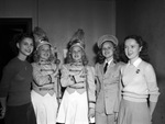 Graduates from the class of 1947 at Arlington Heights High School are making plans for college. Discussing their plans, left to right, are Martha Pullen, Betty Maddox, Billy Maddox, Wanda Wilks, and Evelyn Richey. Miss Pullen is wearing a sweater and a skirt. The Maddox twins are dressed in band uniforms and are carrying batons. Miss Wilks is wearing a Reserve Officers' Training Corps (R. O. T. C.) uniform. Miss Richey is dressed in a collared blouse, a sweater, and a skirt. All five girls are with the Lena Pope Home.