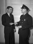 Jack Wood buying ticket from fireman F. E. Nicholson at the Fireman's Pension Benefit dance.