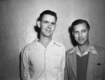 Garner Wells, right, is the new manager of Bowlanes, a bowling alley in Fort Worth, Texas. Mr. Wells was competing in a pot-game with other competitors when he toppled every pin in twelve consecutive rolls. The perfect 300 game was the fifth of Mr. Wells' career. He has a composite average of 201, reported to be the highest figure in Texas. Mr. Wells is shown standing with another man (unidentified) against a wall. He is wearing a collared shirt, sweater, and a blazer. Both men are smiling for the camera. Wells made his best showing nationally in the Peterson Singles Classic in 1943 when his pin total of 1722, only eight from the top, won second place. For the past 15 years he has been a resident of Dallas. Published in the Fort Worth Star-Telegram morning edition, November 24, 1946.